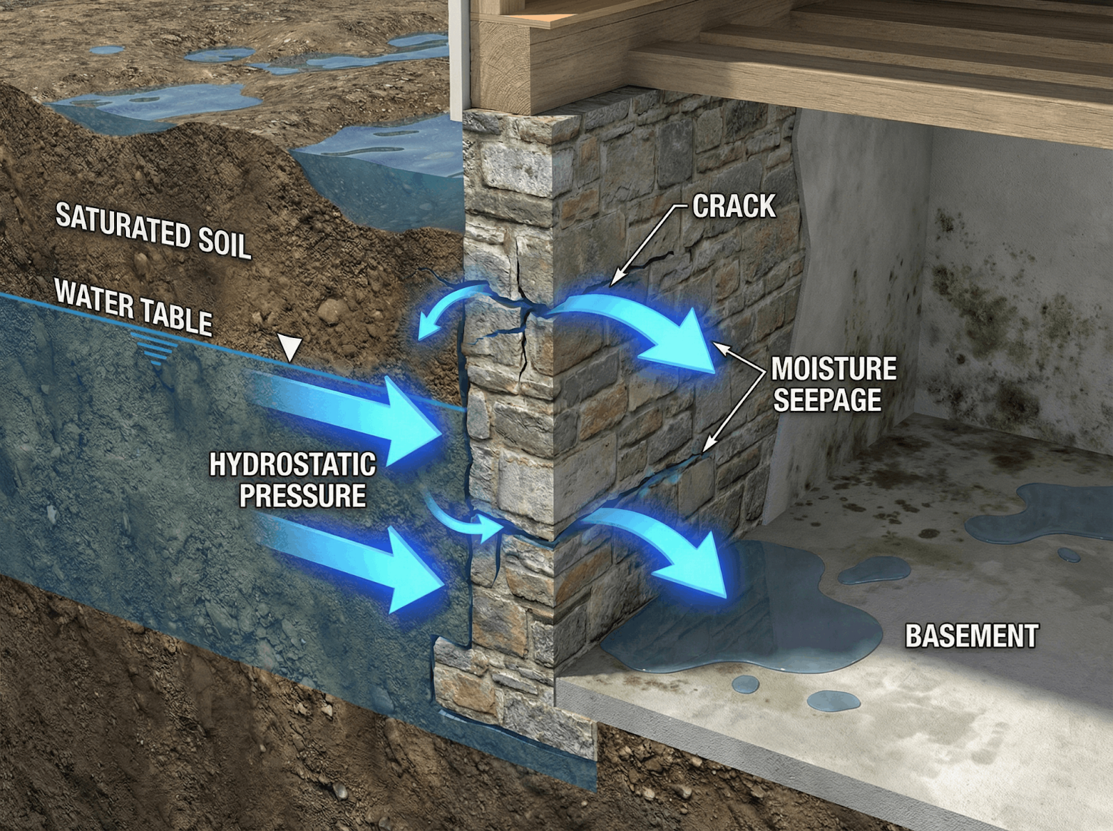 Water intrusion isn't the only concern when hydrostatic pressure breaches a home. Saturated environments often lead to secondary damage that requires specialized expertise to resolve.